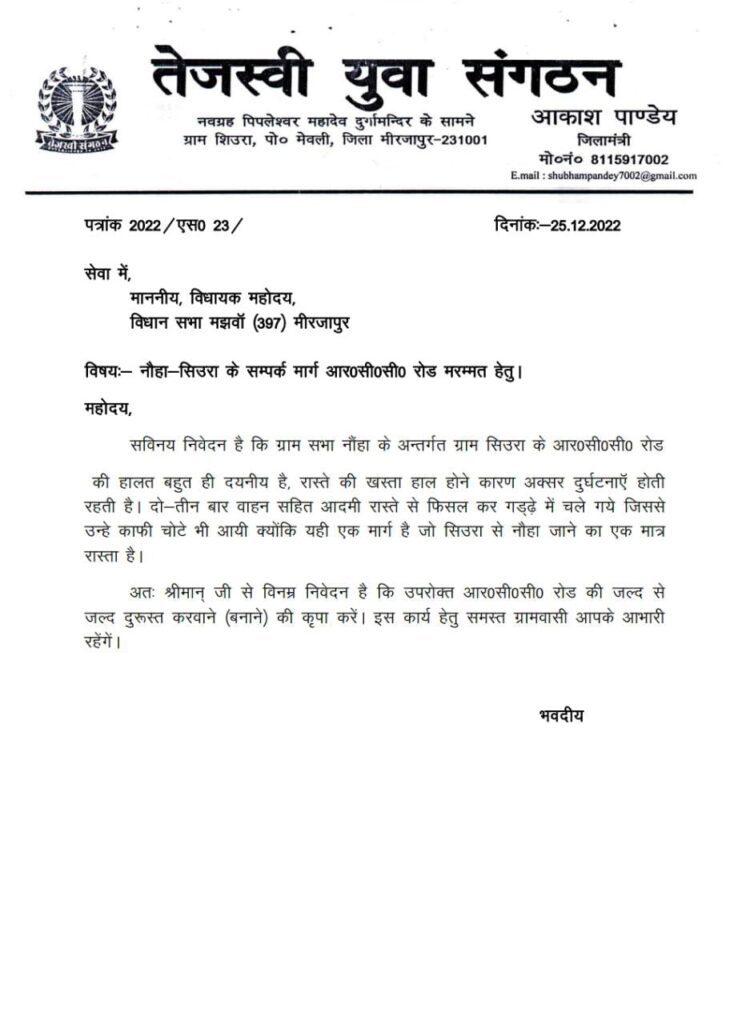 मिर्जापुर: विधानसभा मझवाॅ के अन्तर्गत ग्राम सभा नौहा के ग्राम सिउरा में खस्ताहाल सड़क निर्माण हेतु तेजस्वी युवा संगठन के द्वारा सड़क निर्माण करवाने के लिए ज्ञापन दिया गया, और अवगत कराया गया की आये दिन खराब सड़क होने के कारण दुर्घटनाएं हो रही है,यह सड़क कई गांवों को जोड़ती हैं,कई वर्षों से खस्ताहाल हुई है। देखना यह है की ज्ञापन देने के बाद भी क्या निर्माण हो पाएगा, क्योंकि उत्तर प्रदेश सरकार सड़कों के निमार्ण के बड़े-बड़े दावे करती है। जब तक गांवों का विकास नहीं होगा तब तक विकास नहीं दिखता है, विकास के सभी दावों की पोल खुलती रहेंगी।