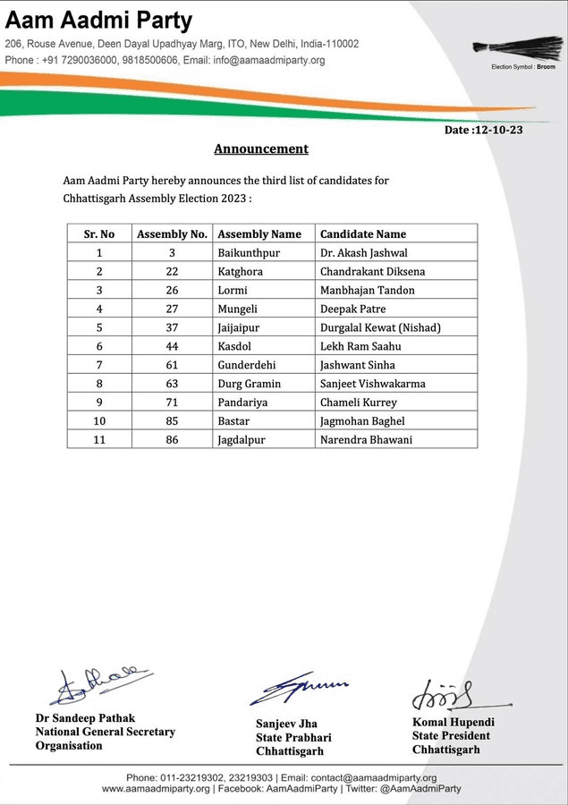 आम आदमी पार्टी ने आगामी विधानसभा चुनाव के लिए अपने उम्मीदवारों की तीसरी सूची जारी कर दी है। इस सूची में पार्टी की ओर से 11 उम्मीदवारों के नाम की घोषणा की गई है।